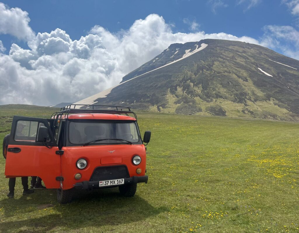 Nada más despertarme, conozco en persona a Vicente de la Rosa, en adelante “Vicen”, que será mi compañero en estos días en la aventura por el Cáucaso. Ha llegado a las 4:00 de la madrugada al alojamiento, procedente de Murcia y previamente habíamos hablado del viaje por Whatsapp con muy buen entendimiento; intuyo que será un gran compañero. Es mañana de presentaciones y Tigran nos introduce Garik que será el peón/ayudante estos días. Subimos a nuestro vehículo (una poca discreta furgoneta color naranja estilo soviético, muy auténtica). A medio camino entre Erevan y Azhdahak Base Camp recogemos a Chiara y Matteo, una pareja de italianos que compartirán con nosotros estas 2 días en el campo base.