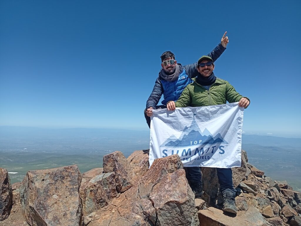 Llegamos a 4.090 metros y lo celebramos con Vicen. Él no está tan acostumbrado al trekking pero lo cierto es que es un crack y un todoterreno en múltiples y muy diferenciados ámbitos y campos de la vida. La bandera de TSOW se fusiona con el cielo y el techo de Armenia en la que supone la 25ª conquista de un techo mundial, un hito nada despreciable y que me llena de felicidad y orgullo. Como aventurero y montañero que me considero, es una buena huella todo este recorrido completado hasta aquí y espero poder seguir avanzando en este proyecto que tanto me llena el espíritu y la mochila de vida.