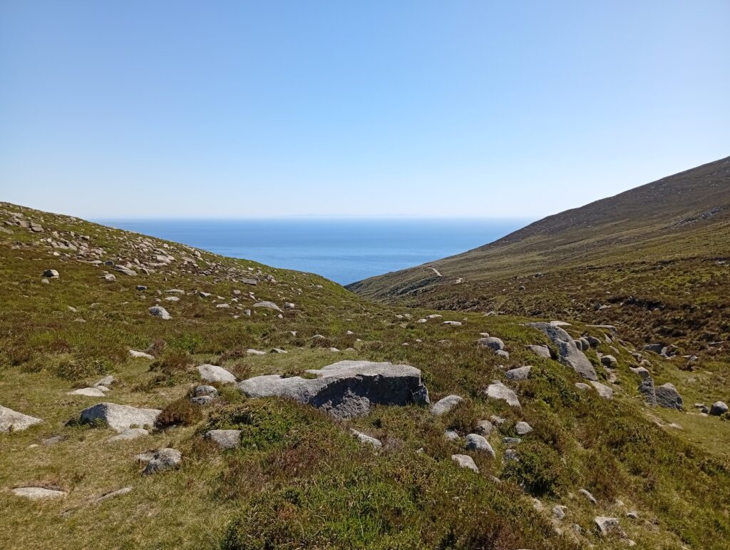 La ruta es circular y no repite camino si bien después de la cima, la “muralla norirlandesa” sigue, si bien esta vez, más civilizadamente, caminamos por el sendero paralelo a ella y hasta llegar a otro collado. Desde este collado, ya se divisa el mar así que sobre las 15:30 completamos una hermosa excursión de 13,5 kilómetros y un desnivel positivo de 879 metros.