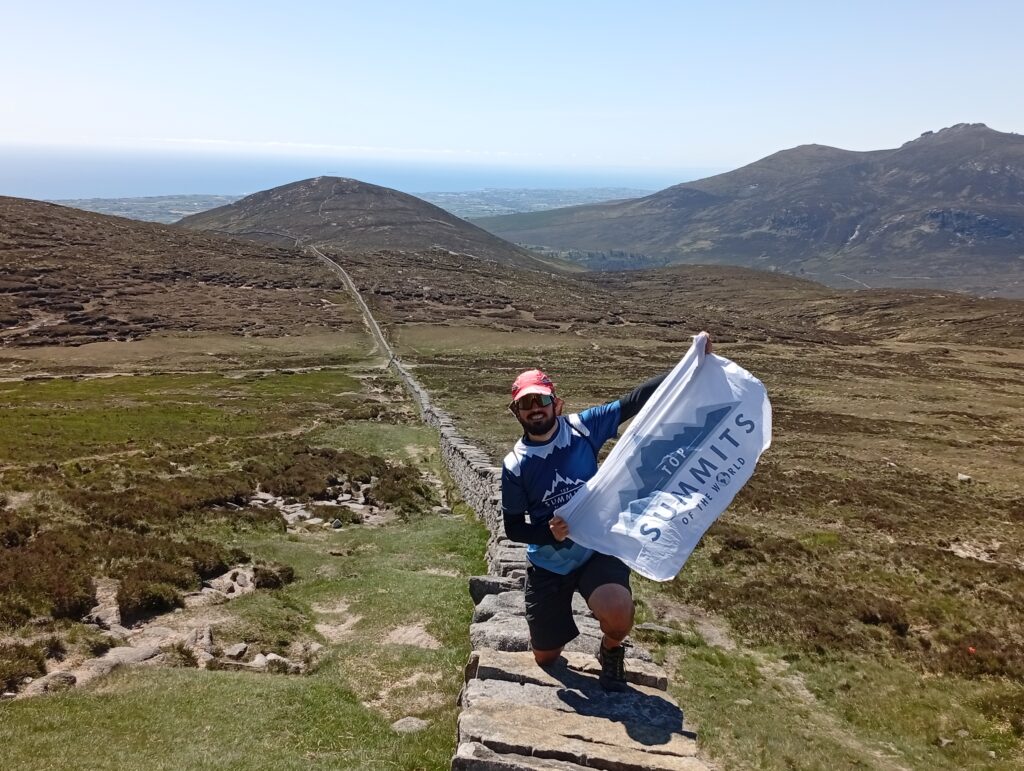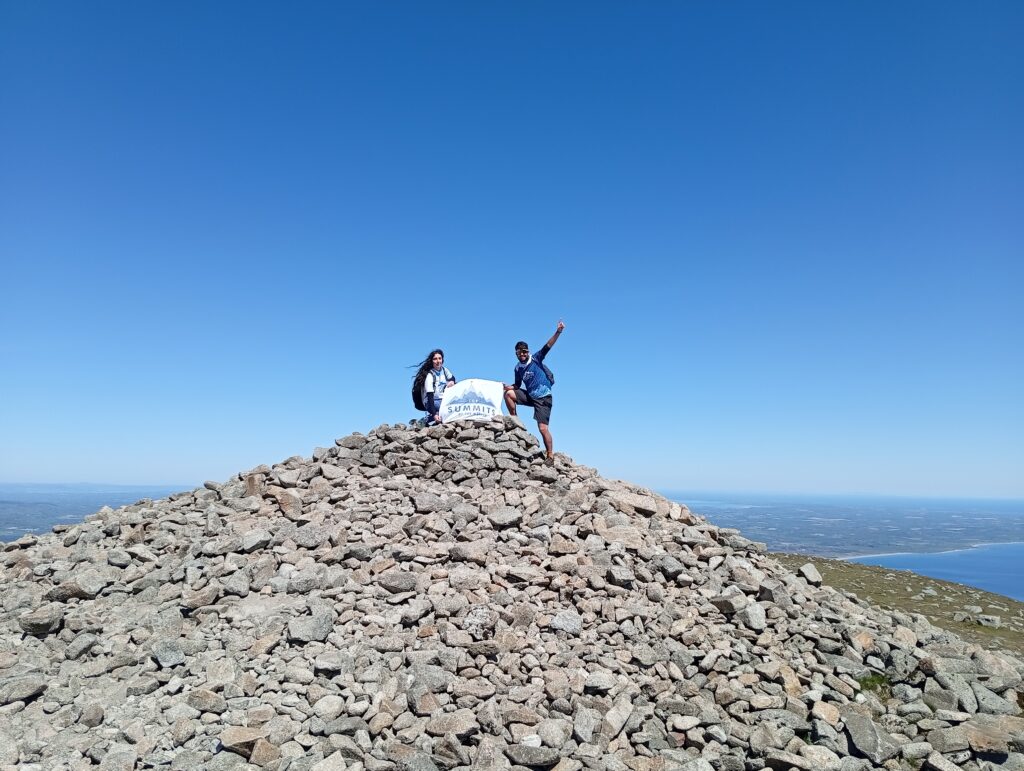 Nos lo pasamos muy bien avanzando por la pared de piedra y es que no cada día uno puede andar por encima de una pared de piedra de casi 2 metros de altura. Sin darnos cuenta alcanzamos los 850 metros del Slieve Donard que nos regala unas vistas 360 espectaculares y que nos permite incluso divisar las Islas Man en el horizonte. Es el segundo techo mundial de Maria tras el recientemente alcanzado de San Marino y primero dentro del proyecto TSOW y la felicito. No está acostumbrada a completar 850 metros positivos con regularidad y la verdad es que lo ha hecho muy bien, con una gran voluntad y actitud ante el reto que tenía delante. Inmortalizamos el momento con la bandera de TSOW que es universal y no entiende de barreras y confrontaciones, ni de diferencias políticas ya que su propósito es unir el mundo a través de sus techos mundiales.